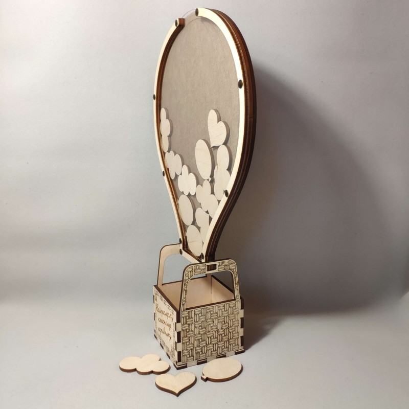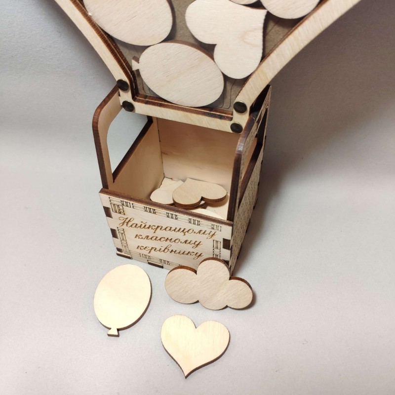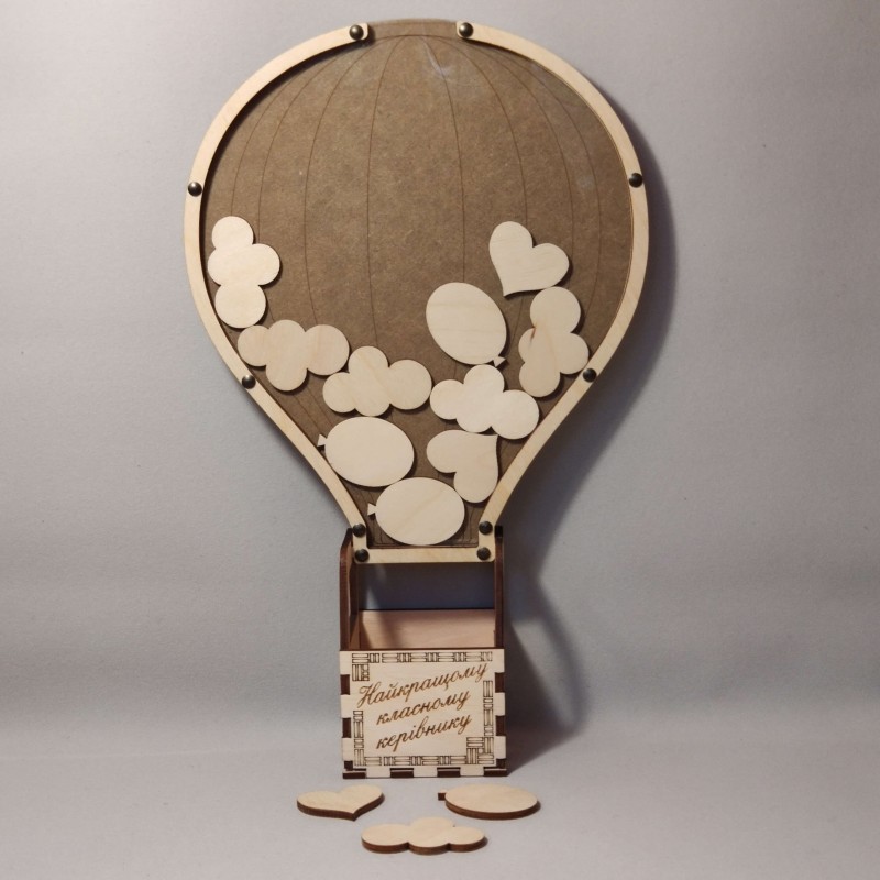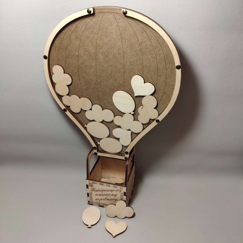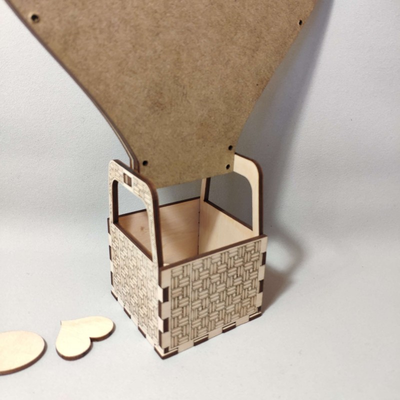 | Материал: | Корзина: фанера 3 мм. Шар: фанера 3 и 4 мм, МДФ 3 мм, ПЭТ 1 мм, металл. |