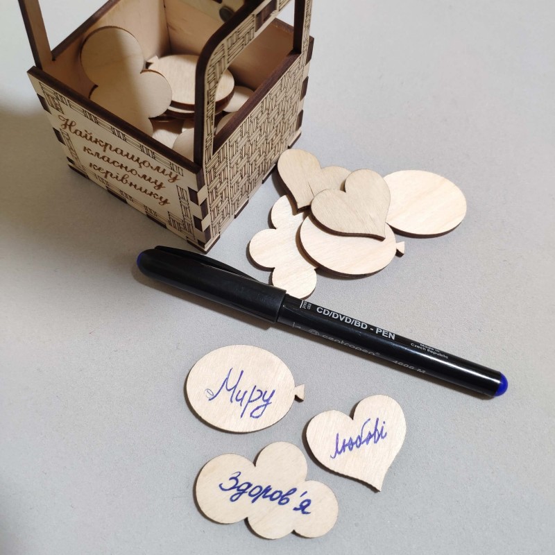 Поздравления и дарственные надписи на корзине, воздушном шаре, пожелания на сердечках (облаках, шариках) наносятся методом лазерной гравировки на украинском, русском или английском языках.